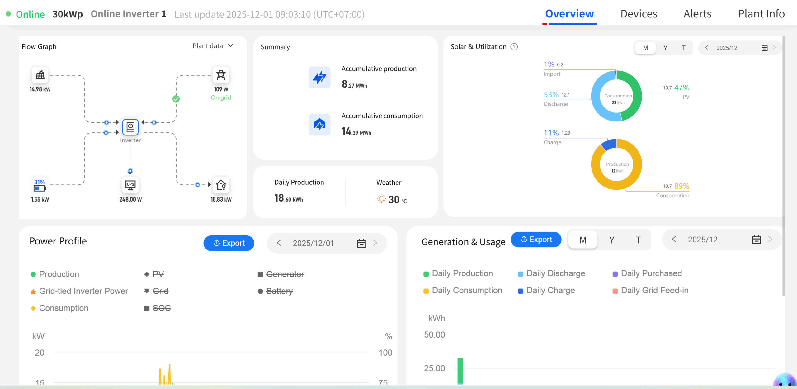 – Bộ giám sát từ xa: Dùng để theo dõi hoạt động của hệ thống. Có thể xem được công suất, sản lượng điện, tình trạng ắc quy, … Theo dõi qua Smartphone, máy tính bảng, laptop,… có kết nối internet.